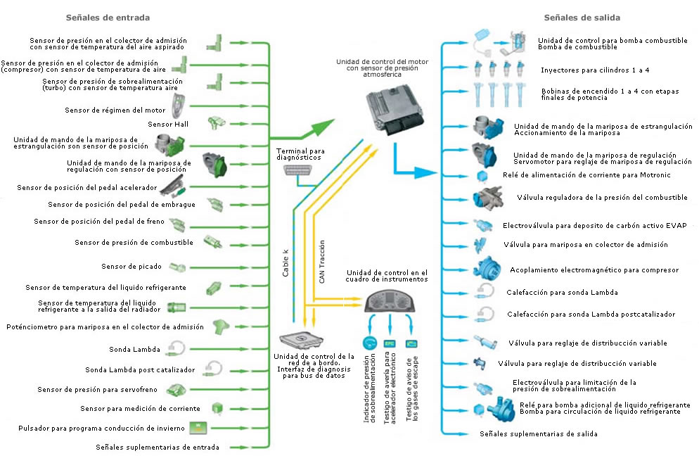 Dependiendo del nivel tecnologico de la centralita del motor, esta puede revisar la informacion que monitorizan unos u otro sensores. Los sensores emiten señales para que la ECU las compare por medio del microprocesador con los datos de referencia de la memoria y asi la unidad ordenara a los actuadores la mejor opcion para el funcionamiento optimo del motor